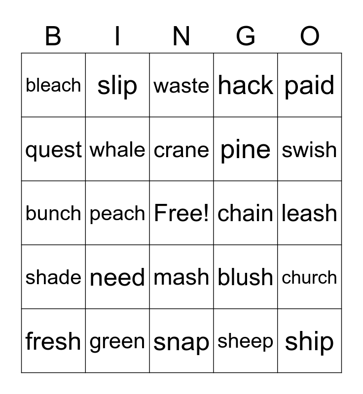 This bingo card has a free space and 32 words: sheep, aid, peach, soap, shade, whale, paid, church, slip, crack, crane, waste, pride, slope, chain, nice, fresh, bunch, mash, need, blush, leap, leash, green, ship, hack, pine, quest, bleach, snap, weak and swish.