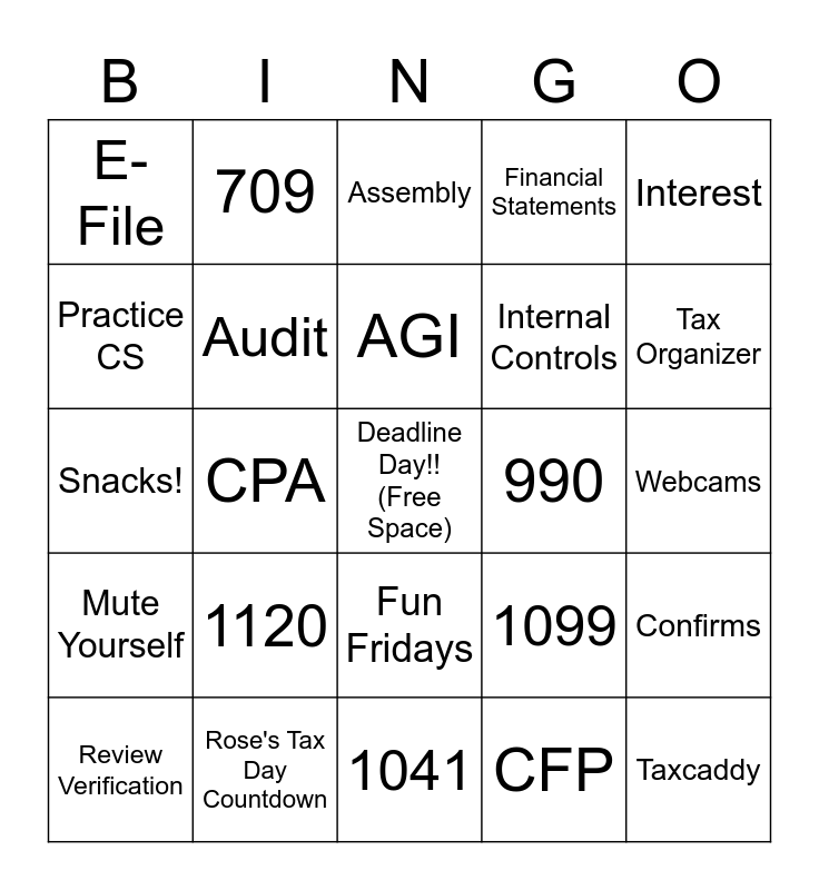 This bingo card has a free space and 51 words: Sureprep, Taxcaddy, 1040, 1041, 1120, 1065, 709, Ultratax, Practice CS, Engagement, Audit, Financial Statements, Confirms, 1099, IRS, FTB, AGI, 990, Dividends, Interest, CPA, CFP, E-File, Internal Controls, AICPA, Fieldwork, Tax Organizer, Extension, Review Verification, Assembly, Inquiry, SAS Letter, Amended Return, Mike McLaren Sliding Across a File Cabinet, Interns, Rose's Tax Day Countdown, RBCo Branded Crocs, Zoom Meetings, New Phones, The Never-Ending 2020 Busy Season, Webcams, Mute Yourself, Ball Shooters, The Box, Carrot Cake, Seasonal Staff, Snacks!, I am not a cat, Jamie's Riddles, Fun Fridays and Coffee... all day, every day.