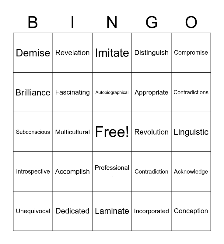 This bingo card has a free space and 24 words: Accomplish, Dedicated, Autobiographical, Unequivocal, Compromise, Demise, Brilliance, Revelation, Revolution, Professional ., Appropriate, Subconscious, Contradiction, Acknowledge, Fascinating, Incorporated, Linguistic, Imitate, Contradictions, Multicultural, Conception, Introspective, Distinguish and Laminate.