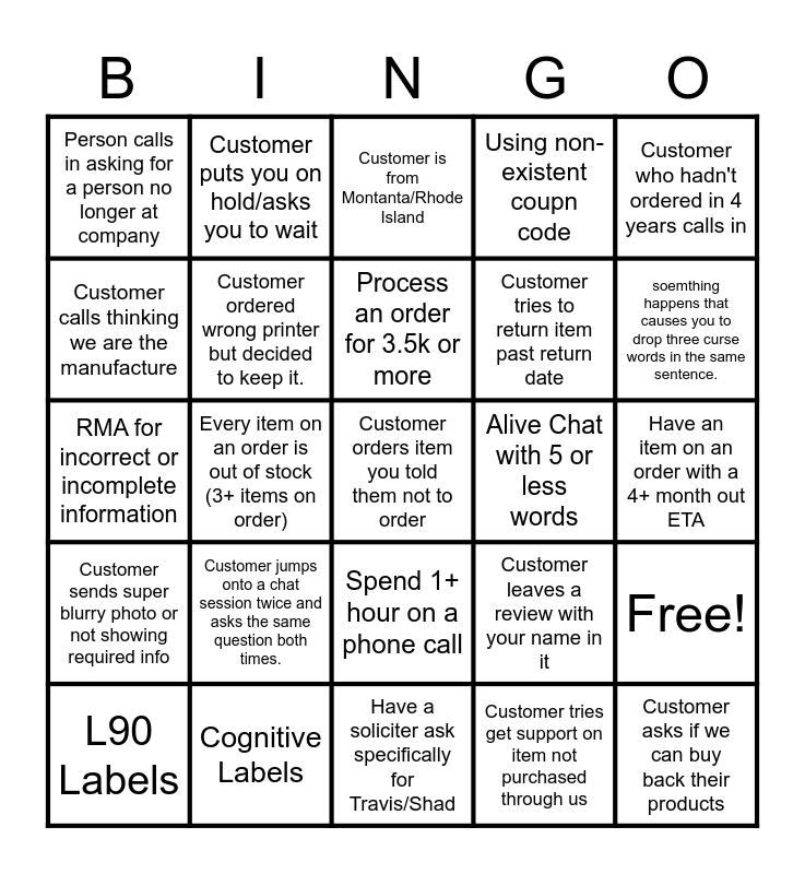 This bingo card has 28 words: Free!, Network/phones go down, Customer tries to return item past return date, Customer tries get support on item not purchased through us, Customer calls thinking we are the manufacture, Customer is from Montanta/Rhode Island, Customer puts you on hold/asks you to wait, Customer sends super blurry photo or not showing required info, Alive Chat with 5 or less words, L90 Labels, RMA for incorrect or incomplete information, Using non-existent coupn code, Cognitive Labels, Have a soliciter ask specifically for Travis/Shad, soemthing happens that causes you to drop three curse words in the same sentence., Customer orders or asks for something that is at least 2 versions behind the most current unit, Customer jumps onto a chat session twice and asks the same question both times., Customer ordered wrong printer but decided to keep it., Process an order for 3.5k or more, Spend 1+ hour on a phone call, Person calls in asking for a person no longer at company, Customer asks if we can buy back their products, Customer orders item you told them not to order, Every item on an order is out of stock (3+ items on order), Have an item on an order with a 4+ month out ETA, Customer leaves a review with your name in it, Customer who hadn't ordered in 4 years calls in and Customer enters order with customer notes ALL IN COPS.