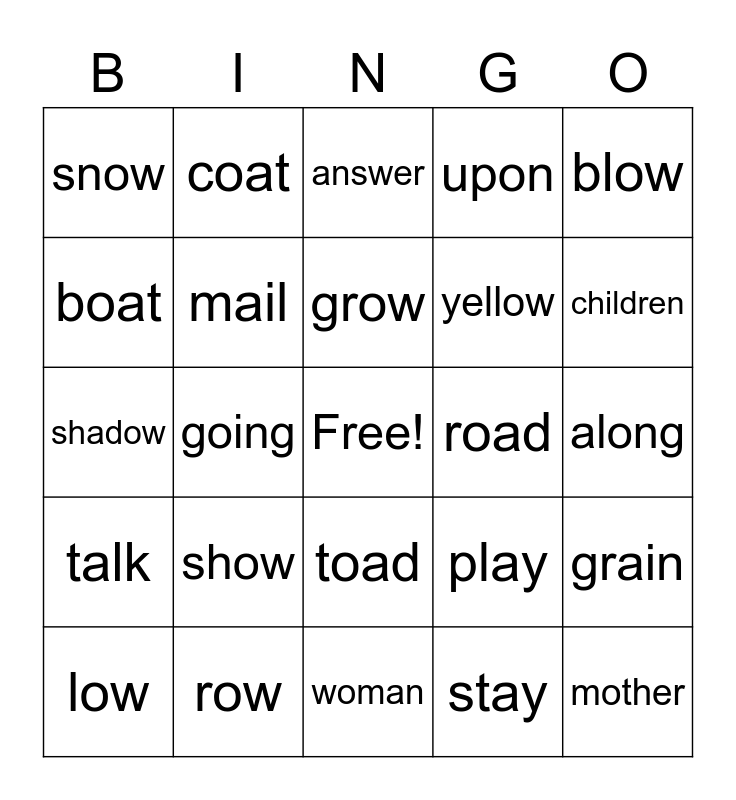 This bingo card has a free space and 24 words: show, row, grow, low, blow, snow, boat, coat, road, toad, yellow, shadow, play, grain, mail, stay, along, answer, children, going, mother, talk, upon and woman.
