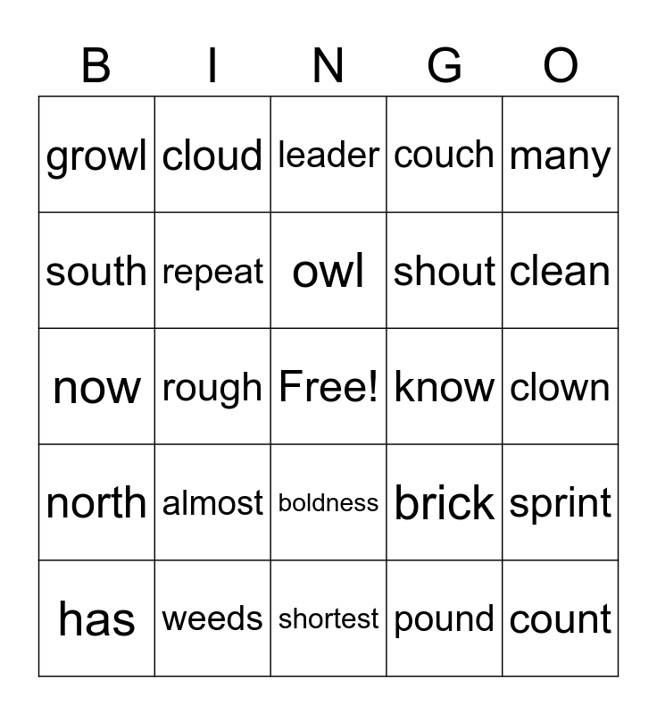 This bingo card has a free space and 29 words: has, proud, rough, remove, growl, leader, repeat, almost, know, weeds, clown, count, shortest, pound, clean, about, boldness, north, many, now, brick, brown, shout, south, couch, cloud, sprint, owl and spring.