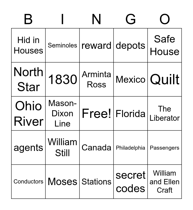 This bingo card has a free space and 25 words: William Still, Stations, Arminta Ross, Conductors, Safe House, Hid in Houses, North Star, Seminoles, Florida, Canada, Mexico, Ohio River, Philadelphia, Passengers, 1830, Quakers, The Liberator, reward, Quilt, Mason-Dixon Line, William and Ellen Craft, Moses, agents, depots and secret codes.