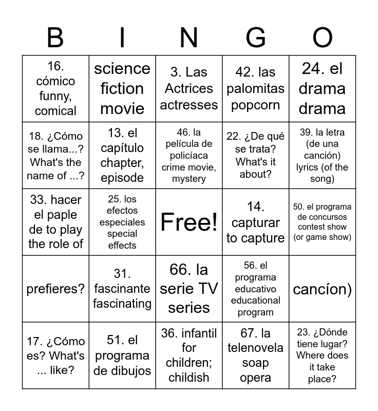 This bingo card has a free space and 82 words: 1. Los Actores Actors, 2. El Actor Principal main actor, 3. Las Actrices actresses, 4. la actriz principal leading actress, 5. la actuación acting, performance, 6. A mí me encanta/n I love -----, 7. A mí me gusta/n I like ----, 8. A mí no me gusta/n I don't like ----, 9. A mí no me gusta/n nada I really don't like ----, 10. la app app, 11. el canal channel, 12. la canción song, 13. el capítulo chapter, episode, 14. capturar to capture, 15. la comedia comedy, 16. cómico funny, comical, 17. ¿Cómo es? What's ... like?, 18. ¿Cómo se llama...? What's the name of ...?, 19. ¿Con cuánta frecuencia? How often?, 20. la consola de videojuegos videogame console, 21. el critico critic, 22. ¿De qué se trata? What's it about?, 23. ¿Dónde tiene lugar? Where does it take place?, 24. el drama drama, 25. los efectos especiales special effects, 26. emocionante exciting, 27. enamorarse to fall in love, 28. en mi opinión in my opinion, 29. estar basado en to be based on, 30. el extraterrestre extraterrestrial, 31. fascinante fascinating, 32. el galán leading man, 33. hacer el paple de to play the role of, 34. ha visto s/he has seen, 35. he visto I've seen, 36. infantil for children; childish, 37. interesante interesting, 38. ir al cine to go to the movies, 39. la letra (de una canción) lyrics (of the song), 40. el móvil, el celular cell phone, 41. opino que in my opinon, I think that, 42. las palomitas popcorn, 43. la película movie, 44. la película de ciencia, ficción, science fiction movie, 45. la película de horror horror movie, 46. la película de policíaca crime movie, mystery, 47. la pelicula romantica romantic movie, 48. peliculas animadas animated movies, 49. el personaje principal main character, 50. el programa de concursos contest show (or game show), 51. el programa de dibujos, animandos, cartoon show, 52. el programa de entrevistas interview program, 53. el programa de la vida real reality program, 54. el programa de noticias news program, 55. el programa deportivo sports show, 56. el programa educativo educational program, 57. el programa musical musical program, 58. ¿Qué género de películas, prefieres?, What genre/type of movies do, you prefer?, 59. ¿Qué opinas de...? What is your opinion about...?, 60. ¿Quieres ir...? Do you want to go to...?, 61. realista realistic, 62. las redes sociales social media, 63. los refrescos/las bebidas refreshments/drinks, 64. el ritmo rhythm, beat, 65. se llama is called, 66. la serie TV series, 67. la telenovela soap opera, 68. tonto silly, foolish, 69. tratarse de to be about, 70. triste sad, gloomy, 71. los videojuegos video games, 72. violento violent, 73. los vocales (de una, cancíon) and vocals (of a song).