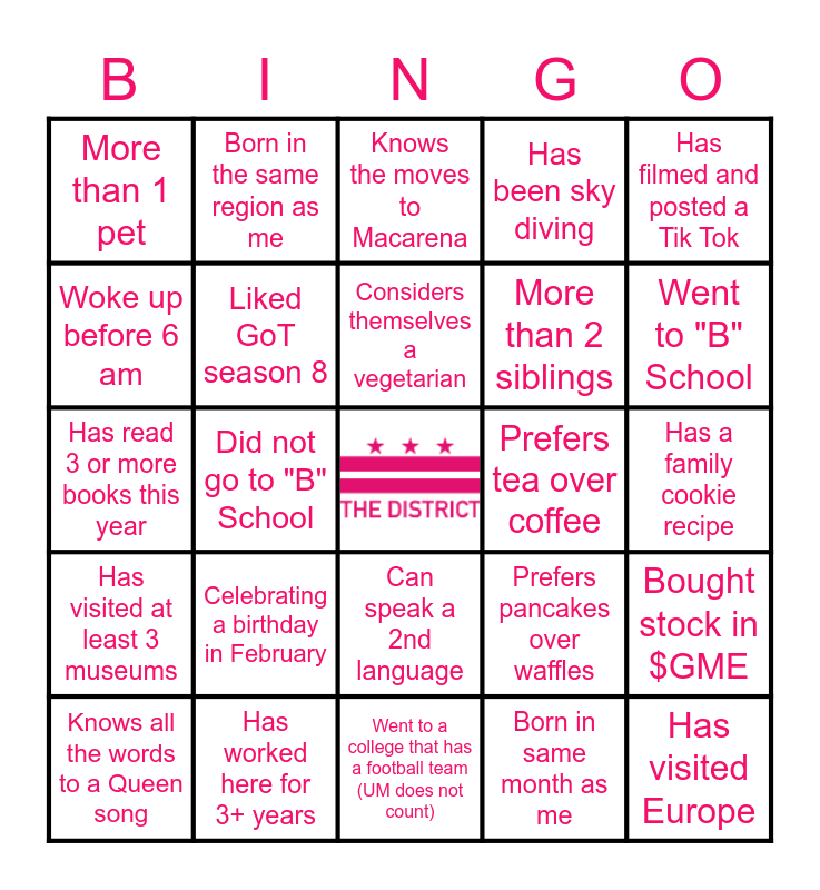 This bingo card has a free space and 24 words: Celebrating a birthday in February, Has worked here for 3+ years, Considers themselves a vegetarian, Knows all the words to a Queen song, Has filmed and posted a Tik Tok, More than 1 pet, Woke up before 6 am, Born in the same region as me, Prefers tea over coffee, Can speak a 2nd language, More than 2 siblings, Has read 3 or more books this year, Prefers pancakes over waffles, Bought stock in $GME, Liked GoT season 8, Born in same month as me, Has a family cookie recipe, Knows the moves to Macarena, Went to "B" School, Did not go to "B" School, Has visited Europe, Has visited at least 3 museums, Has been sky diving and Went to a college that has a football team (UM does not count).