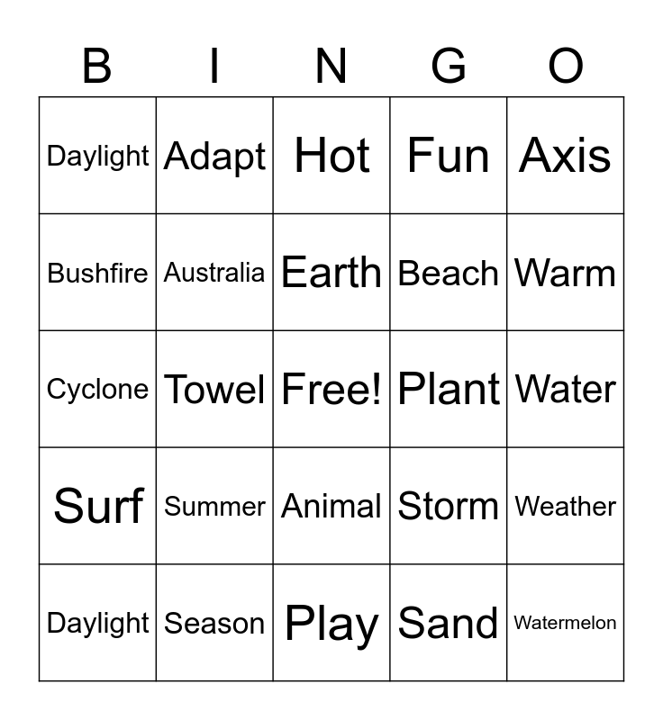 This bingo card has a free space and 24 words: Summer, Season, Earth, Daylight, Axis, Daylight, Bushfire, Adapt, Plant, Animal, Beach, Cyclone, Storm, Weather, Australia, Sand, Water, Hot, Warm, Towel, Watermelon, Surf, Fun and Play.