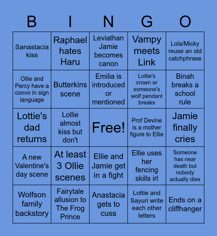 This bingo card has a free space and 24 words: Wolfson family backstory, At least 3 Ollie scenes, Emilia is introduced or mentioned, Lottie and Sayuri write each other letters, Lola/Micky reuse an old catchphrase, Sanastacia kiss, Raphael hates Haru, Leviathan Jamie becomes canon, Prof Devine is a mother figure to Ellie, Jamie finally cries, Lottie's dad returns, Butterkins scene, Ellie uses her fencing skills irl, Someone has near death but nobody actually dies, Ollie and Percy have a convo in sign language, Fairytale allusion to The Frog Prince, Anastacia gets to cuss, Vampy meets Link, Binah breaks a school rule, A new Valentine's day scene, Lollie almost kiss but don't, Ellie and Jamie get in a fight, Lottie's crown or someone's wolf pendant breaks and Ends on a cliffhanger.
