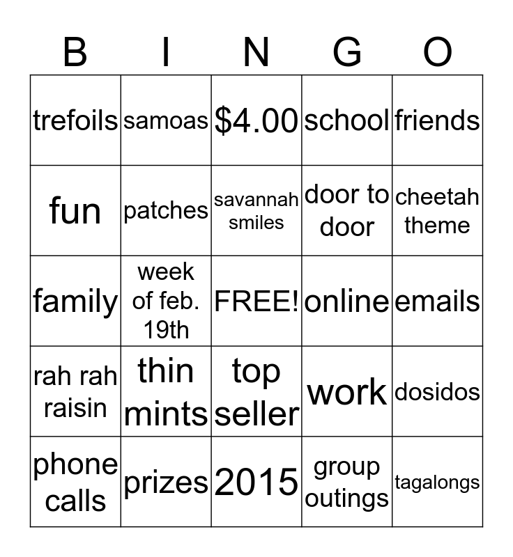 This bingo card has a free space and 24 words: thin mints, prizes, savannah smiles, phone calls, friends, trefoils, fun, samoas, online, top seller, door to door, family, work, dosidos, patches, group outings, emails, $4.00, cheetah theme, week of feb. 19th, tagalongs, rah rah raisin, school and 2015.