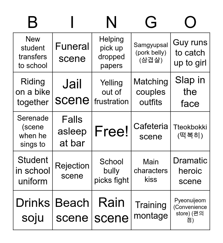 This bingo card has a free space and 29 words: Drinks soju, Hospital scene, Falls asleep at bar, Ahjumma fighting people, New student transfers to school, Helping pick up dropped papers, Jail scene, Rejection scene, Cafeteria scene, Beach scene, Tteokbokki (떡복히), Pyeonuijeom (Convenience store) (편의점), Rain scene, Training montage, Slap in the face, Hiding together, School bully picks fight, Student in school uniform, Guy runs to catch up to girl, Serenade (scene when he sings to, Main characters kiss, Cheesy pick up line (im new here, Matching couples outfits, Riding on a bike together, Samgyupsal (pork belly) (삼겹살), Funeral scene, Dramatic heroic scene, Yelling out of frustration and Seeing your crush with another guy.