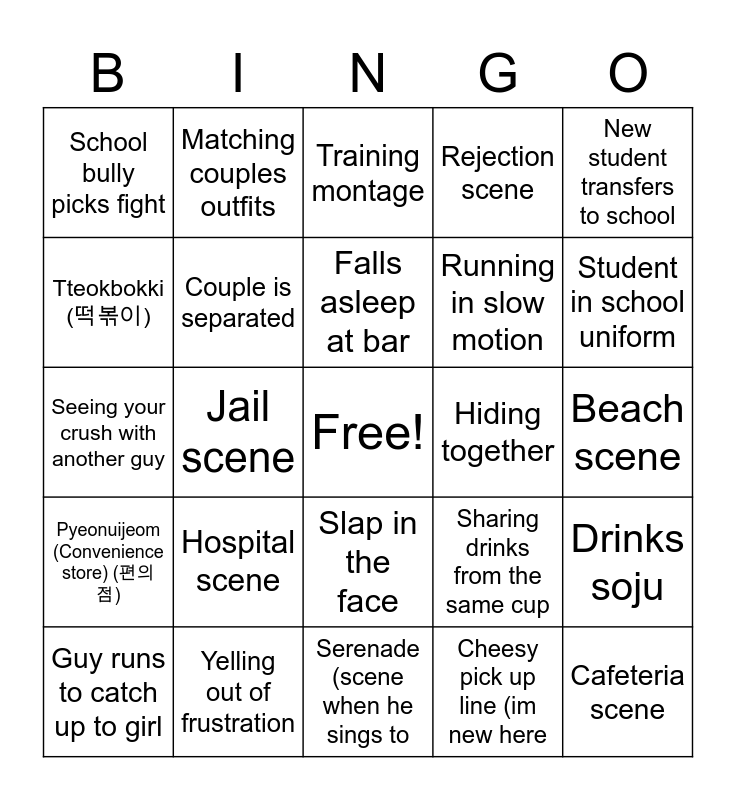 This bingo card has a free space and 37 words: Flash back scene, Student gets spanked by teacher, Guy goes off to military, Couple is separated, Drinks soju, Hospital scene, Falls asleep at bar, Ahjumma fighting people, New student transfers to school, Helping pick up dropped papers, Jail scene, Rejection scene, Cafeteria scene, Beach scene, Tteokbokki (떡볶이), Pyeonuijeom (Convenience store) (편의점), Rain scene, Training montage, Slap in the face, Hiding together, School bully picks fight, Student in school uniform, Guy runs to catch up to girl, Serenade (scene when he sings to, Main characters kiss, Cheesy pick up line (im new here, Matching couples outfits, Riding on a bike together, Samgyupsal (pork belly) (삼겹살), Funeral scene, Dramatic heroic scene, Yelling out of frustration, Seeing your crush with another guy, Crying alone with sad piano background music, Sharing drinks from the same cup, Running in slow motion and Holding hands.