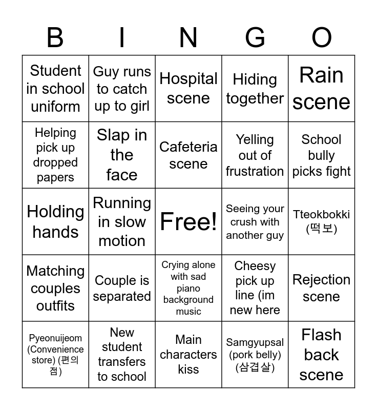 This bingo card has a free space and 24 words: Couple is separated, New student transfers to school, Cafeteria scene, Pyeonuijeom (Convenience store) (편의점), Rain scene, Student in school uniform, Helping pick up dropped papers, Guy runs to catch up to girl, Seeing your crush with another guy, Crying alone with sad piano background music, Yelling out of frustration, Holding hands, Cheesy pick up line (im new here, Rejection scene, Slap in the face, Samgyupsal (pork belly) (삼겹살), Tteokbokki (떡보), Hospital scene, School bully picks fight, Running in slow motion, Flash back scene, Matching couples outfits, Hiding together and Main characters kiss.