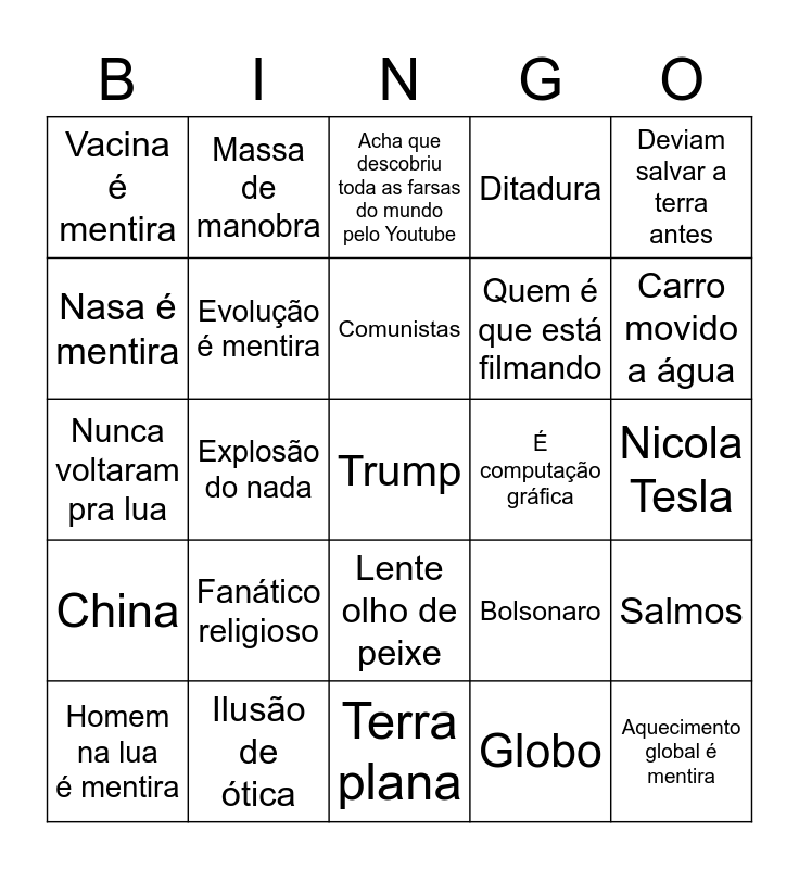 This bingo card has 25 words: Fanático religioso, Terra plana, Comunistas, Homem na lua é mentira, Deviam salvar a terra antes, Vacina é mentira, Nasa é mentira, Massa de manobra, É computação gráfica, Lente olho de peixe, Quem é que está filmando, Nunca voltaram pra lua, Bolsonaro, Salmos, Evolução é mentira, Aquecimento global é mentira, Nicola Tesla, Acha que descobriu toda as farsas do mundo pelo Youtube, Carro movido a água, Explosão do nada, Trump, Ilusão de ótica, China, Ditadura and Globo.