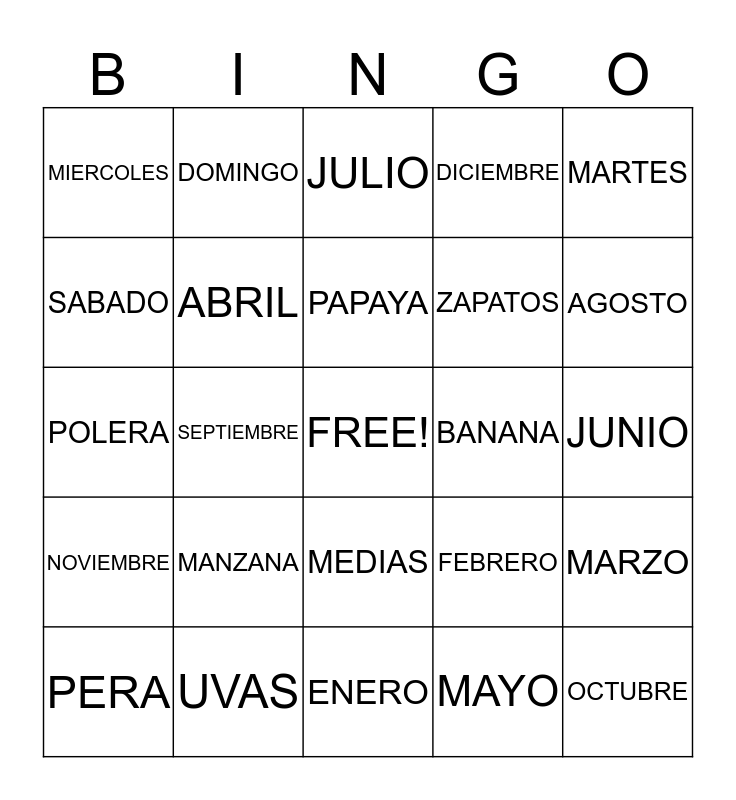 This bingo card has a free space and 24 words: MANZANA, UVAS, PAPAYA, PERA, MARTES, MIERCOLES, SABADO, DOMINGO, BANANA, MEDIAS, ZAPATOS, POLERA, FEBRERO, MARZO, ABRIL, MAYO, JUNIO, JULIO, AGOSTO, SEPTIEMBRE, OCTUBRE, NOVIEMBRE, DICIEMBRE and ENERO.
