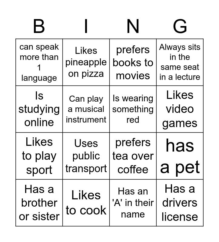 This bingo card has 16 words: Likes to cook, has a pet, prefers books to movies, can speak more than 1 language, Likes to play sport, Likes pineapple on pizza, prefers tea over coffee, Has an 'A' in their name, Is studying online, Can play a musical instrument, Has a brother or sister, Always sits in the same seat in a lecture, Uses public transport, Likes video games, Is wearing something red and Has a drivers license.