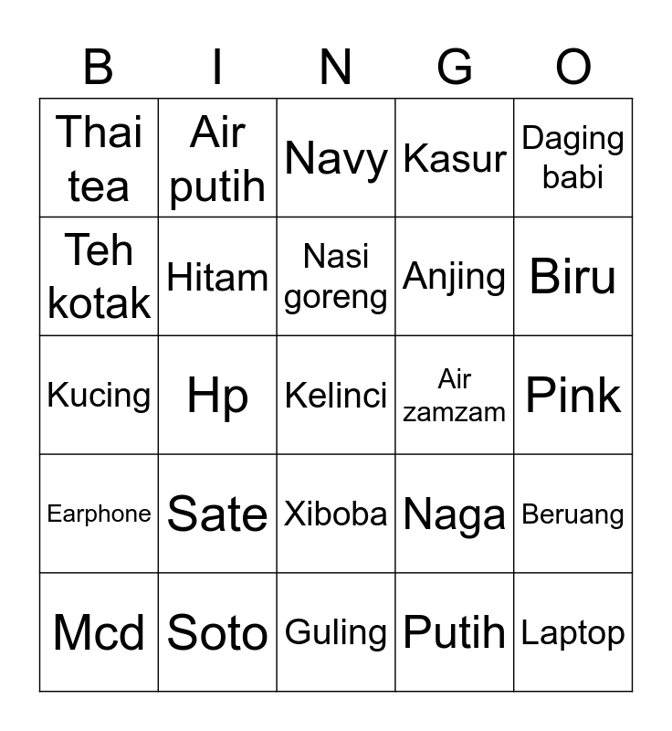 This bingo card has a free space and 24 words: Sate, Soto, Nasi goreng, Mcd, Daging babi, Thai tea, Teh kotak, Air putih, Air zamzam, Xiboba, Anjing, Kucing, Naga, Beruang, Hitam, Putih, Pink, Navy, Biru, Hp, Laptop, Earphone, Kasur and Guling.