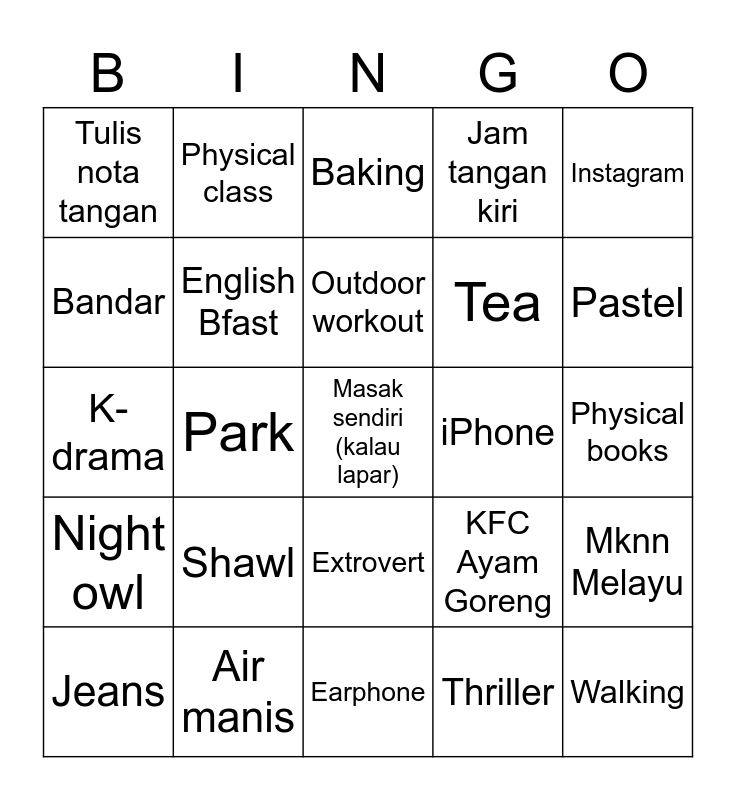 This bingo card has 25 words: Shawl, Earphone, Outdoor workout, Jeans, Instagram, Tulis nota tangan, Bandar, Physical class, iPhone, Extrovert, Tea, K-drama, KFC Ayam Goreng, Mknn Melayu, English Bfast, Walking, Physical books, Baking, Pastel, Park, Masak sendiri (kalau lapar), Air manis, Night owl, Jam tangan kiri and Thriller.