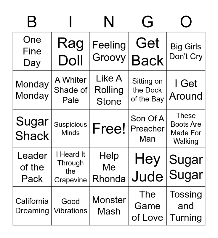 This bingo card has a free space and 29 words: California Dreaming, Respect, Suspicious Minds, I Want You Back, One Fine Day, Feeling Groovy, A Whiter Shade of Pale, I Heard It Through the Grapevine, Son Of A Preacher Man, Good Vibrations, These Boots Are Made For Walking, Tossing and Turning, Monster Mash, The Game of Love, I Get Around, The Locomotion, Help Me Rhonda, Leader of the Pack, Big Girls Don't Cry, Sugar Shack, Hey Jude, The Sound of Silence, Sitting on the Dock of the Bay, Monday Monday, Get Back, Rag Doll, Sugar Sugar, Like A Rolling Stone and Everyday People.