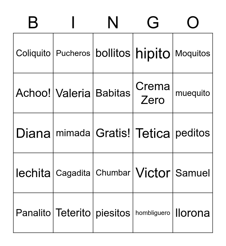 This bingo card has a free space and 24 words: Cagadita, Teterito, Babitas, Panalito, Moquitos, Coliquito, Achoo!, Pucheros, Tetica, Chumbar, Crema Zero, Diana, Victor, Samuel, Valeria, hombliguero, peditos, bollitos, muequito, mimada, llorona, lechita, hipito and piesitos.