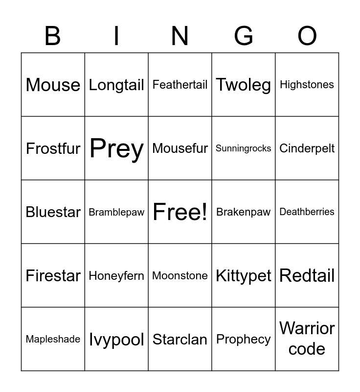 This bingo card has a free space and 27 words: Kittypet, Yarrow, Sunningrocks, Starclan, Frostfur, Feathertail, Longtail, Firestar, Brakenpaw, Redtail, Bluestar, Twoleg, Mapleshade, Ivypool, Cinderpelt, Graypaw, Prey, Mousefur, Honeyfern, Mouse, Deathberries, Prophecy, Bramblepaw, Warrior code, Moonstone, Highstones and Gathering.