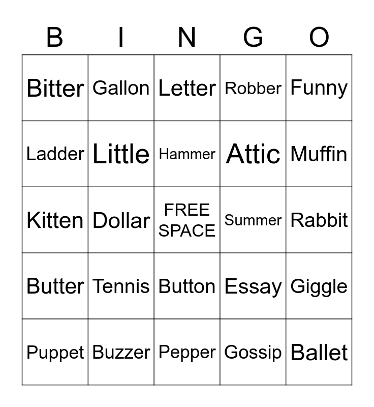 This bingo card has a free space and 24 words: Tennis, Buzzer, Hammer, Puppet, Funny, Bitter, Ladder, Gallon, Summer, Button, Attic, Kitten, Essay, Giggle, Little, Gossip, Rabbit, Letter, Muffin, Dollar, Ballet, Butter, Robber and Pepper.