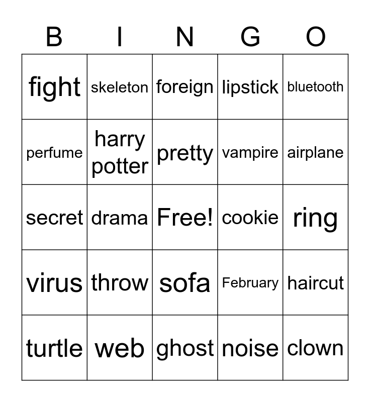 This bingo card has a free space and 39 words: cactus, spaghetti, pirate, harry potter, turtle, sofa, pretty, nickname, bluetooth, virus, drama, lipstick, clown, ring, cookie, throw, catch, fight, who?, February, perfume, ghost, vampire, airplane, remote, breath, gone, titanic, teenager, skeleton, china, Tanos, foreign, web, noise, exit, haircut, secret and muscle.