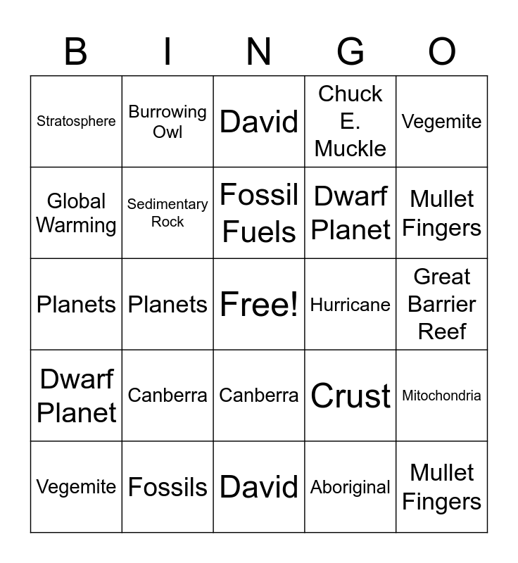⚠ This card has duplicate items: Dana Matherson (2), Mullet Fingers (2), Cowgirl (2), David (2), Canberra (2), Organelle (2), Burrowing Owl (2), Kuiper Belt (2), Global Warming (2), Fossils (2), Sedimentary Rock (2), Chuck E. Muckle (2), Mitochondria (2), Crust (2), Great Barrier Reef (2), Plant Cell (2), Fossil Fuels (2), Hurricane (2), Chloroplast (2), Vegemite (2), Planets (2), Aboriginal (2), Stratosphere (2), Dwarf Planet (2), Constellation (2)