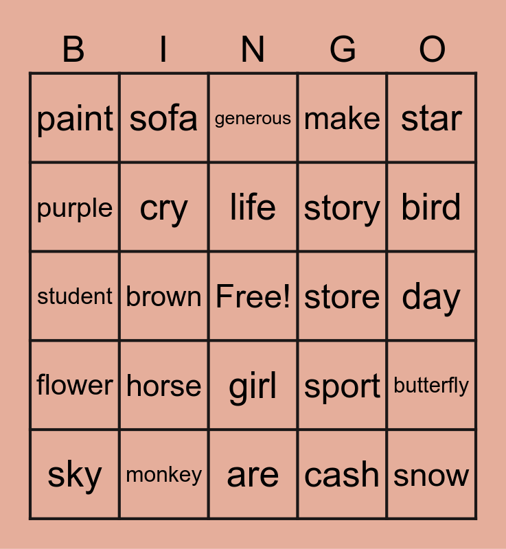 This bingo card has a free space and 39 words: gray, ear, house, cry, sky, girl, life, tiger, star, flower, brown, make, snow, day, store, horse, ice, paint, play, sport, purple, are, story, bird, beautiful, money, bank, simple, person, sofa, teacher, dangerous, generous, monkey, cash, play, butterfly, student and tower.