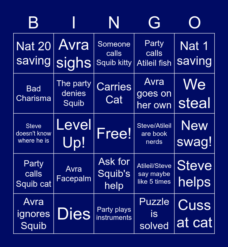 This bingo card has a free space and 24 words: Avra Facepalm, Dies, Carries Cat, Avra ignores Squib, Nat 1 saving, Nat 20 saving, Bad Charisma, Avra sighs, Steve/Atileil are book nerds, Ask for Squib's help, Avra goes on her own, Steve doesn't know where he is, Atileil/Steve say maybe like 5 times, Steve helps, The party denies Squib, Puzzle is solved, New swag!, Someone calls Squib kitty, We steal, Level Up!, Cuss at cat, Party calls Squib cat, Party calls Atileil fish and Party plays instruments.