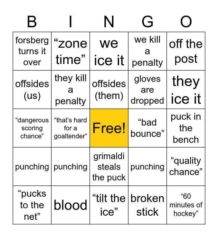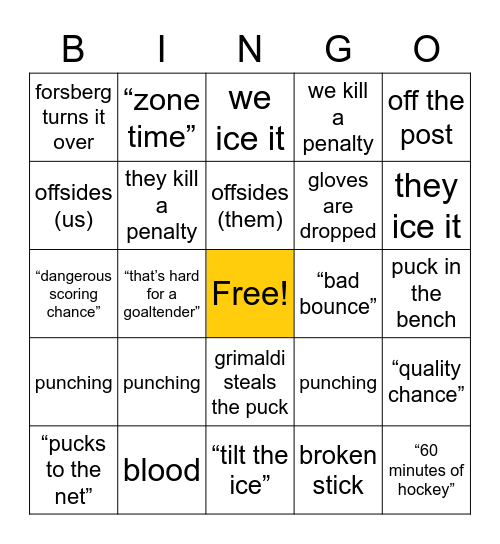 This bingo card has a free space and 24 words: “pucks to the net”, punching, offsides (them), broken stick, off the post, forsberg turns it over, “zone time”, we ice it, “bad bounce”, puck in the bench, “dangerous scoring chance”, they kill a penalty, punching, “quality chance”, offsides (us), blood, “tilt the ice”, we kill a penalty, they ice it, punching, “that’s hard for a goaltender”, grimaldi steals the puck, gloves are dropped and “60 minutes of hockey”.