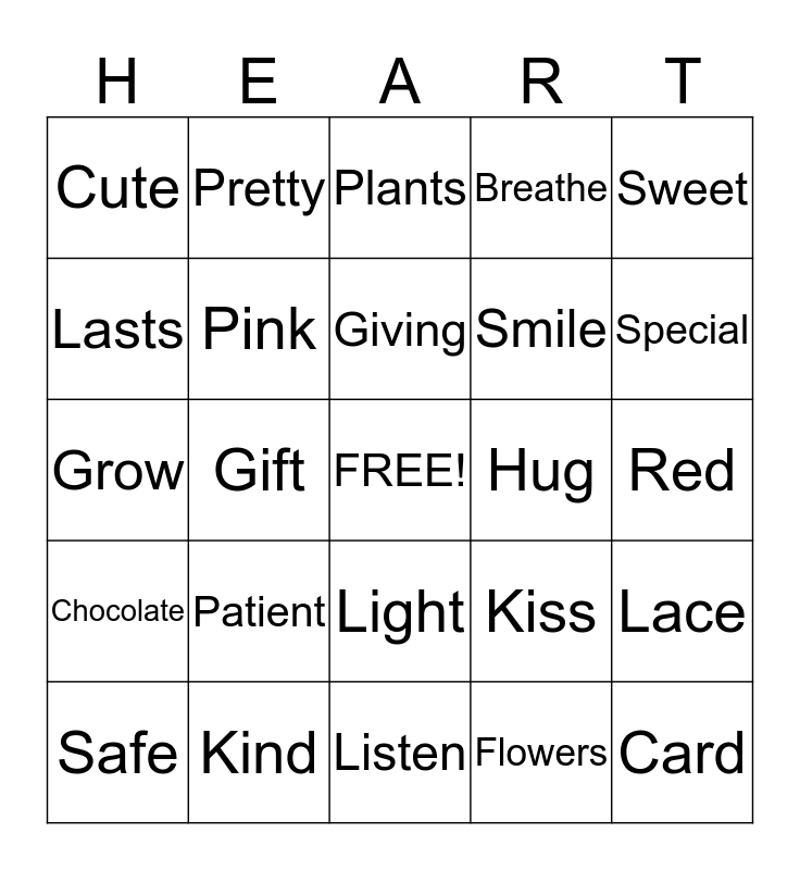 This bingo card has a free space and 24 words: Patient, Kind, Giving, Safe, Sweet, Cute, Lasts, Pretty, Hug, Light, Smile, Grow, Kiss, Lace, Pink, Flowers, Red, Plants, Special, Gift, Card, Chocolate, Breathe and Listen.