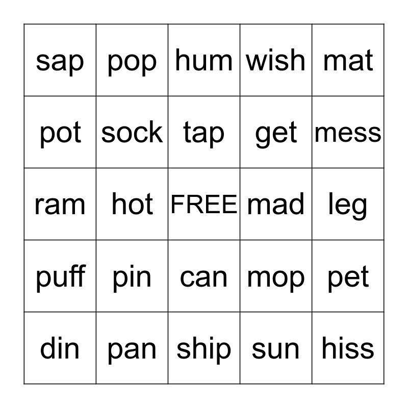 This bingo card has a free space and 24 words: pin, pan, tap, din, mat, sap, pot, pop, mad, can, get, ram, mop, pet, sock, sun, leg, hum, mess, hot, hiss, puff, wish and ship.