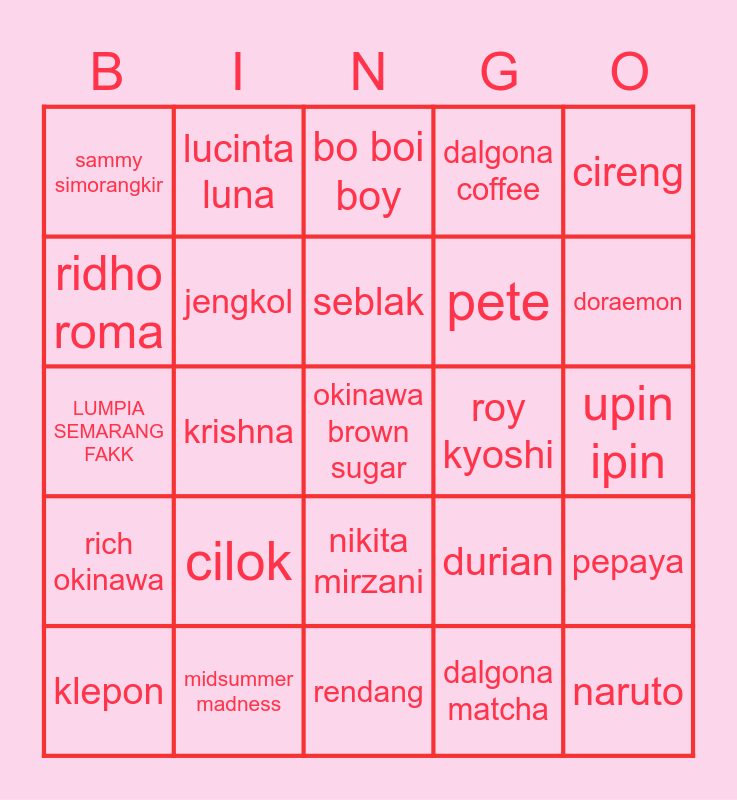 This bingo card has 25 words: cilok, rendang, seblak, klepon, cireng, sammy simorangkir, ridho roma, lucinta luna, roy kyoshi, nikita mirzani, pete, LUMPIA SEMARANG FAKK, durian, pepaya, jengkol, naruto, upin ipin, bo boi boy, doraemon, krishna, okinawa brown sugar, midsummer madness, rich okinawa, dalgona coffee and dalgona matcha.