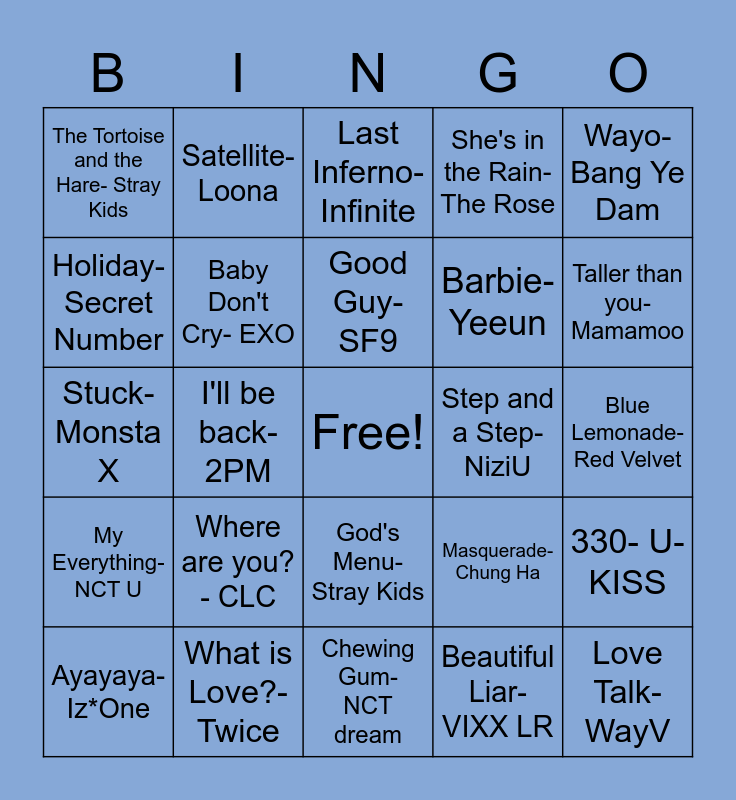 This bingo card has a free space and 24 words: Where are you?- CLC, What is Love?- Twice, Good Guy- SF9, Ayayaya- Iz*One, Wayo- Bang Ye Dam, The Tortoise and the Hare- Stray Kids, Holiday- Secret Number, Satellite- Loona, Step and a Step- NiziU, God's Menu- Stray Kids, Barbie- Yeeun, Stuck- Monsta X, Masquerade- Chung Ha, 330- U-KISS, Baby Don't Cry- EXO, Beautiful Liar- VIXX LR, Blue Lemonade- Red Velvet, Last Inferno- Infinite, Taller than you- Mamamoo, I'll be back- 2PM, Love Talk- WayV, My Everything- NCT U, She's in the Rain- The Rose and Chewing Gum- NCT dream.