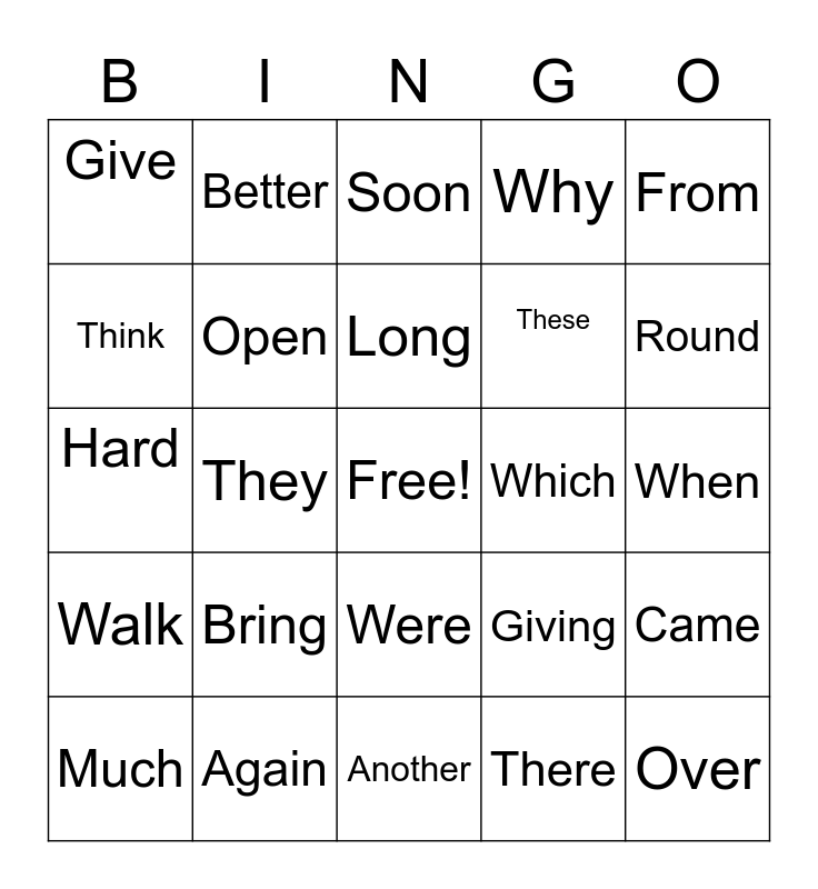 This bingo card has a free space and 24 words: Bring, Again, Long, Much, From, Give, Think, Better, Which, Were, These, Hard, Giving, Came, Open, There, When, Soon, Round, They, Over, Walk, Why and Another.