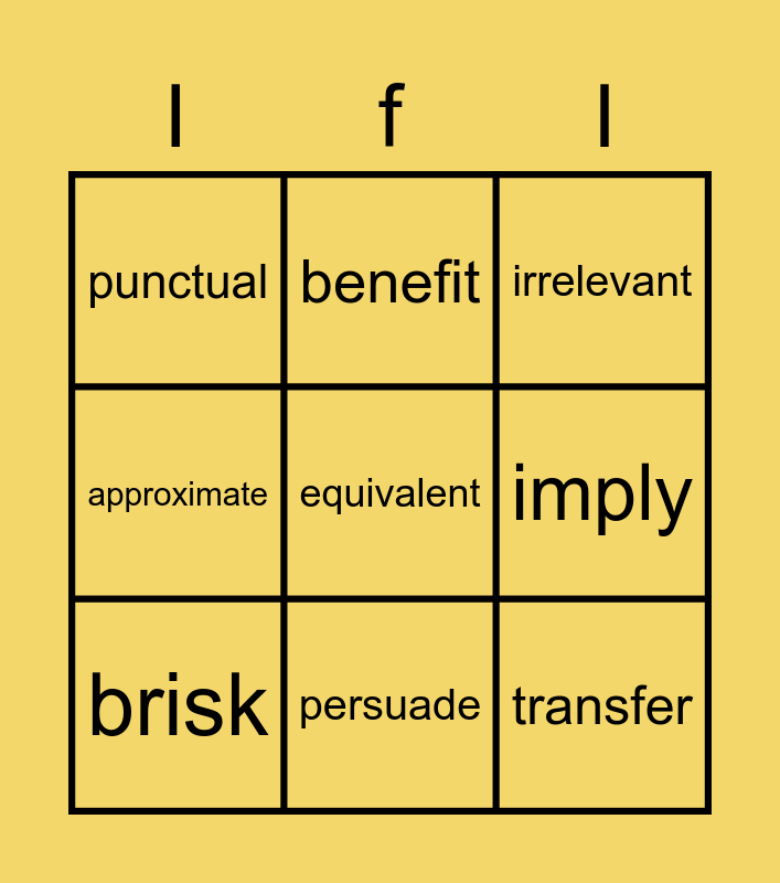 This bingo card has a free space and 8 words: imply, irrelevant, benefit, brisk, punctual, transfer, approximate and persuade.