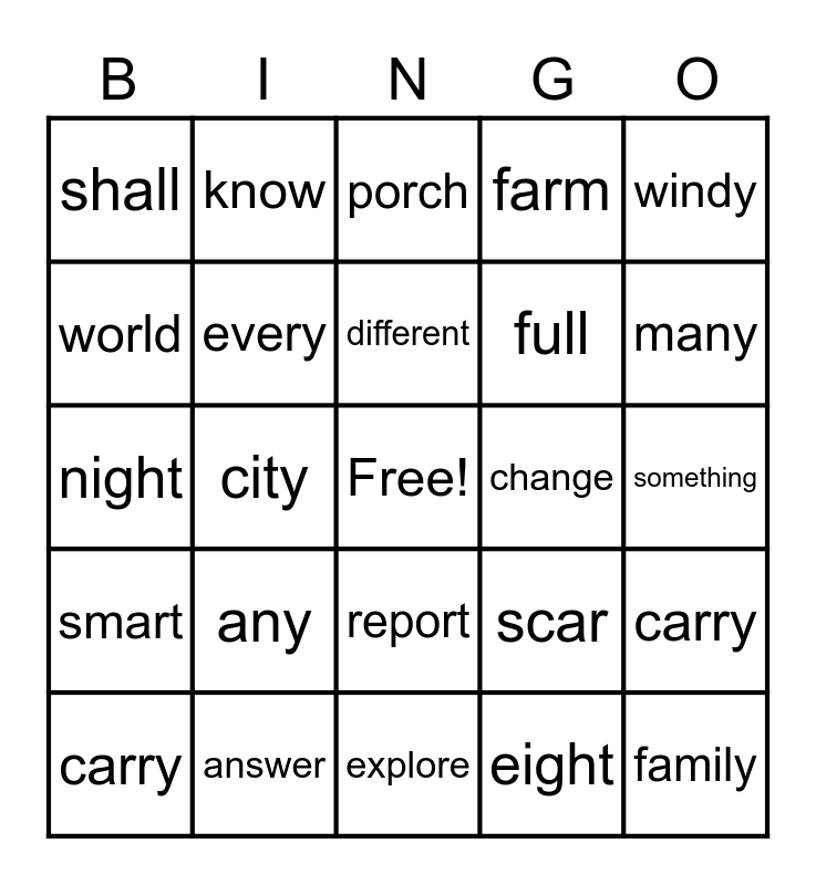 This bingo card has a free space and 24 words: any, answer, different, carry, windy, shall, world, know, change, report, full, night, scar, carry, every, eight, something, porch, many, city, family, smart, farm and explore.