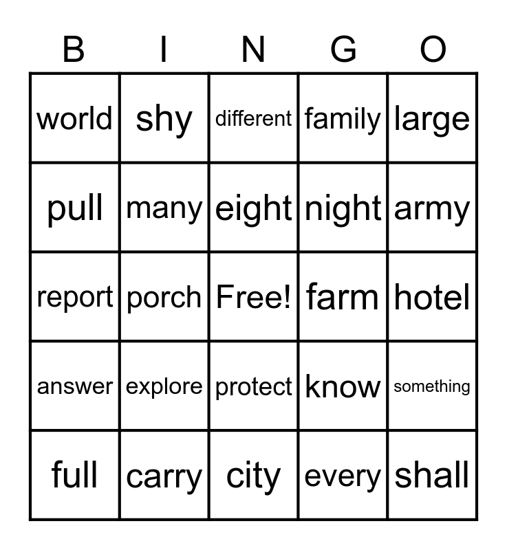 This bingo card has a free space and 24 words: explore, carry, eight, full, large, world, pull, shy, farm, protect, night, report, know, something, many, every, hotel, different, army, porch, shall, answer, family and city.