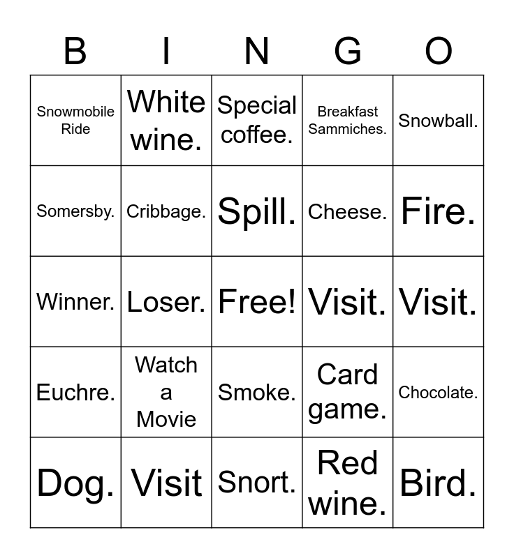 This bingo card has a free space and 24 words: Watch a Movie, Visit, Spill., Dog., Snowball., Snowmobile Ride, Somersby., White wine., Visit., Smoke., Cheese., Winner., Card game., Chocolate., Cribbage., Red wine., Visit., Special coffee., Fire., Loser., Bird., Euchre., Breakfast Sammiches. and Snort..