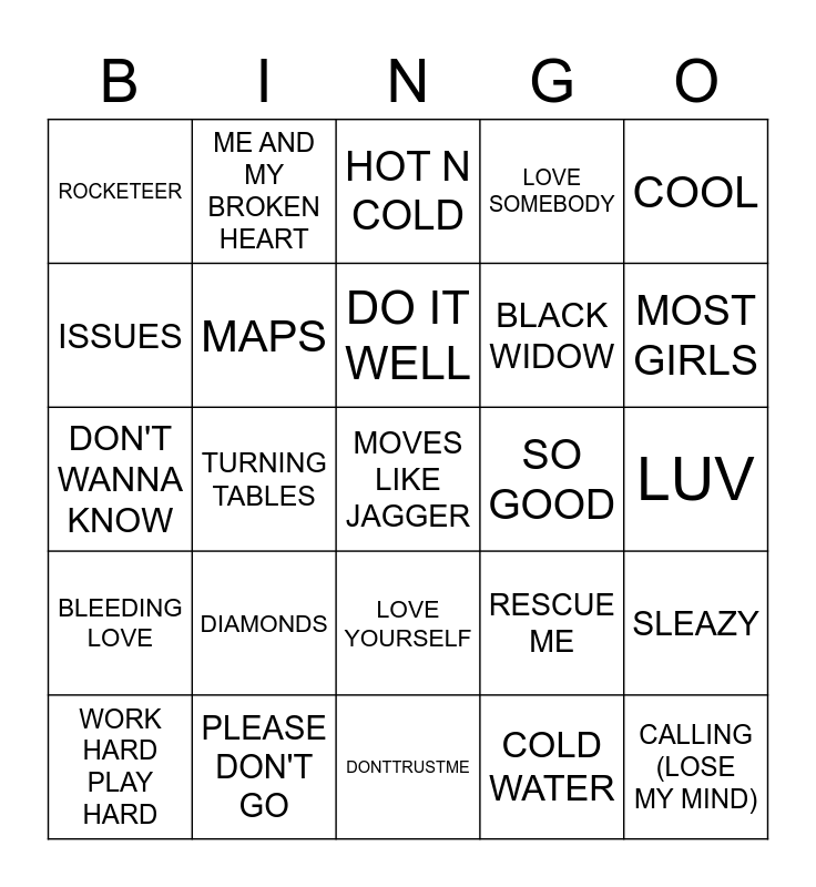 This bingo card has 36 words: SUCKER, HALO, RUMOUR HAS IT, MAPS, RESCUE ME, BLEEDING LOVE, DO IT WELL, BURN, COOL, XO, TURNING TABLES, LOVE SOMEBODY, BATTLEFIELD, SO GOOD, MOST GIRLS, ROCKETEER, CALLING (LOSE MY MIND), DIAMONDS, MOVES LIKE JAGGER, HOT N COLD, LUV, SLEAZY, PLEASE DON'T GO, WORK HARD PLAY HARD, DONTTRUSTME, ME AND MY BROKEN HEART, DON'T WANNA KNOW, NOW OR NEVER, BLACK WIDOW, ISSUES, DON'T, FREAKY FRIDAY, COLD WATER, LOVE YOURSELF, EASTSIDE and I CAN'T GET ENOUGH.