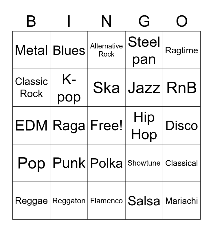This bingo card has a free space and 27 words: Showtune, Country, Jazz, Flamenco, Classic Rock, Alternative Rock, Blues, Pop, Hip Hop, Classical, EDM, Steel pan, Reggae, Reggaton, RnB, Folk, K-pop, Ska, Punk, Metal, Disco, Salsa, Raga, Mariachi, Polka, Ragtime and Bluegrass.