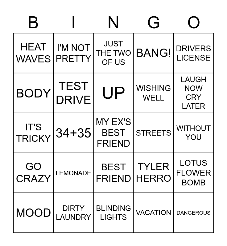 This bingo card has 39 words: SAVE YOUR TEARS, LEVITATING, GOOSEBUMPS, TEST DRIVE, MOOD, BEST FRIEND, UP, HOLY, DRIVERS LICENSE, GO CRAZY, 34+35, BANG!, MY EX'S BEST FRIEND, WITHOUT YOU, STREETS, LEMONADE, THEREFORE I AM, HEAT WAVES, DAKITI, TYLER HERRO, BODY, BLINDING LIGHTS, WISHING WELL, LAUGH NOW CRY LATER, PUT YOUR RECORDS ON, POSITIONS, DANGEROUS, SO PRETTY, BUSS IT, I'M NOT PRETTY, MANEATER, CRY BABY, JUST THE TWO OF US, DIRTY LAUNDRY, VACATION, OOPS!, LOTUS FLOWER BOMB, IT'S TRICKY and HOW BIZARRE.
