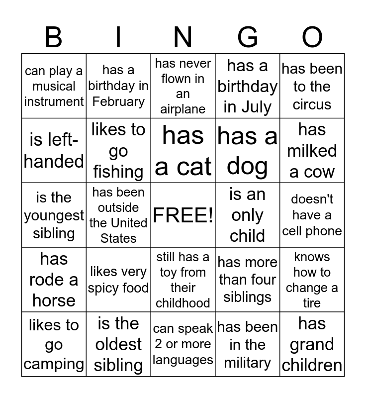 This bingo card has a free space and 31 words: can speak 2 or more languages, was born outside New Jersey, has been outside the United States, has been coming to HH for more than 5 years, can play a musical instrument, has never flown in an airplane, likes to go fishing, has more than four siblings, is an only child, has been in the military, doesn't have a cell phone, has grand children, doesn't drink coffee, has freckles, has milked a cow, has met a celebrity, knows how to change a tire, likes very spicy food, has rode a horse, still has a toy from their childhood, has been to the circus, has been coming to HH for less than a year, likes to go camping, has a birthday in February, has a dog, is left-handed, has a birthday in July, is the youngest sibling, is the oldest sibling, has a cat and lived on the West Coast.