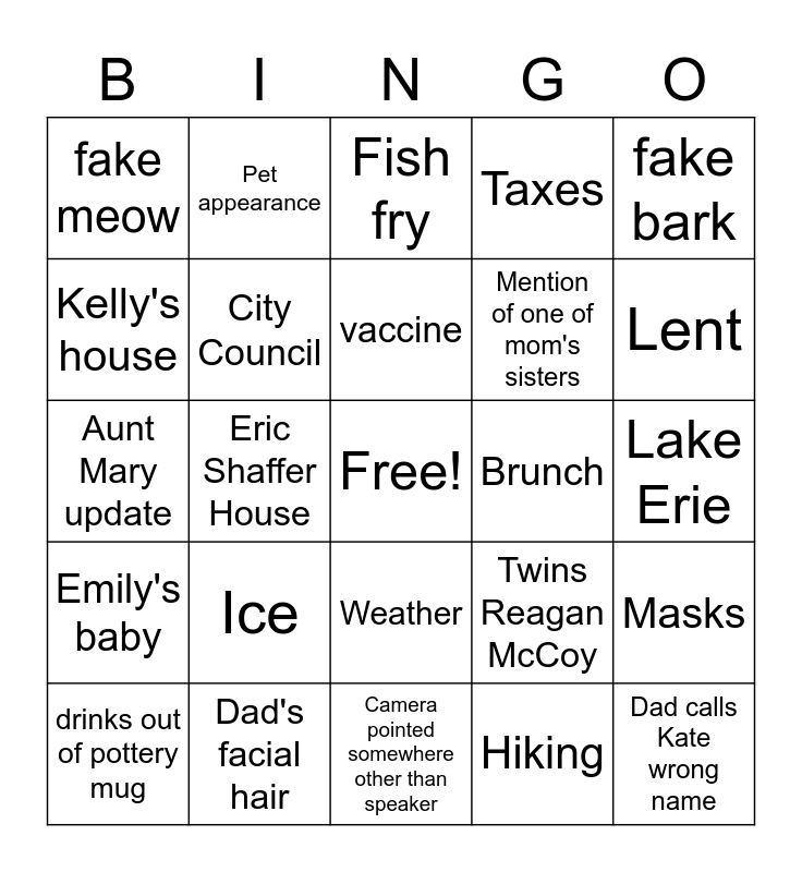 This bingo card has a free space and 24 words: Ice, Dad's facial hair, vaccine, drinks out of pottery mug, fake bark, fake meow, Kelly's house, Pet appearance, Brunch, Weather, Mention of one of mom's sisters, Aunt Mary update, Twins Reagan McCoy, Masks, City Council, Hiking, Lake Erie, Fish fry, Lent, Eric Shaffer House, Dad calls Kate wrong name, Emily's baby, Taxes and Camera pointed somewhere other than speaker.