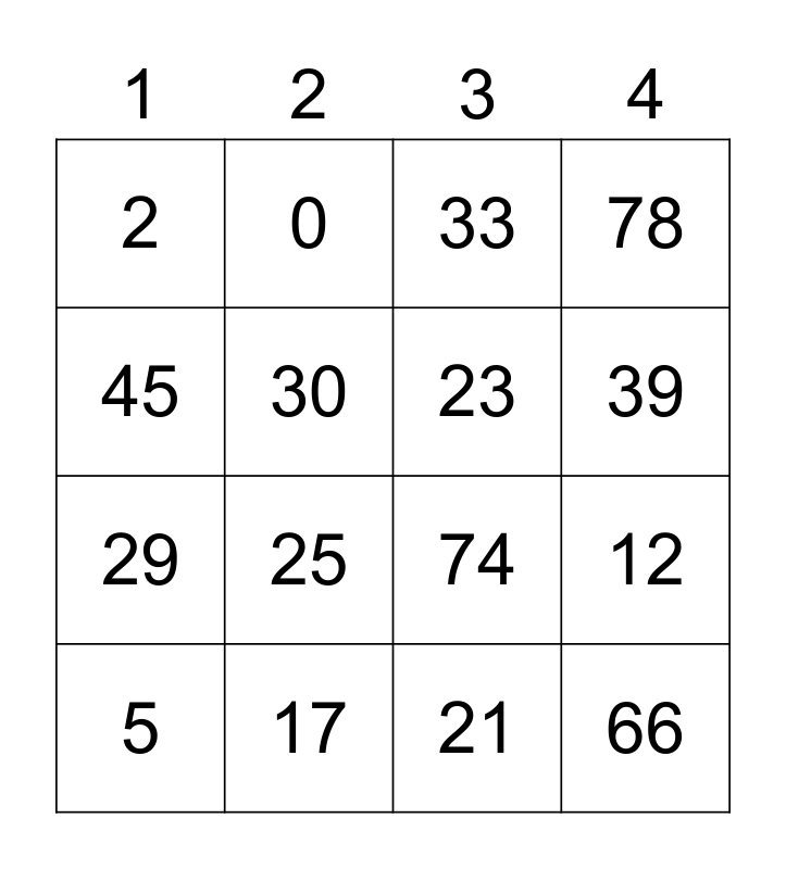 This bingo card has 20 words: 12, 8, 33, 6, 5, 45, 17, 2, 29, 0, 25, 74, 30, 66, 23, 32, 39, 78, 21 and 43.
