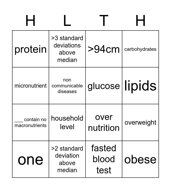 This bingo card has 19 words: over nutrition, >80cm, >94cm, obese, overweight, micronutrient, fasted blood test, protein, >3 standard deviations above median, ___ contain no macronutrients, household level, non communicable diseases, glucose, >2 standard deviation above median, one, body composition, carbohydrates, lipids and World Bank.