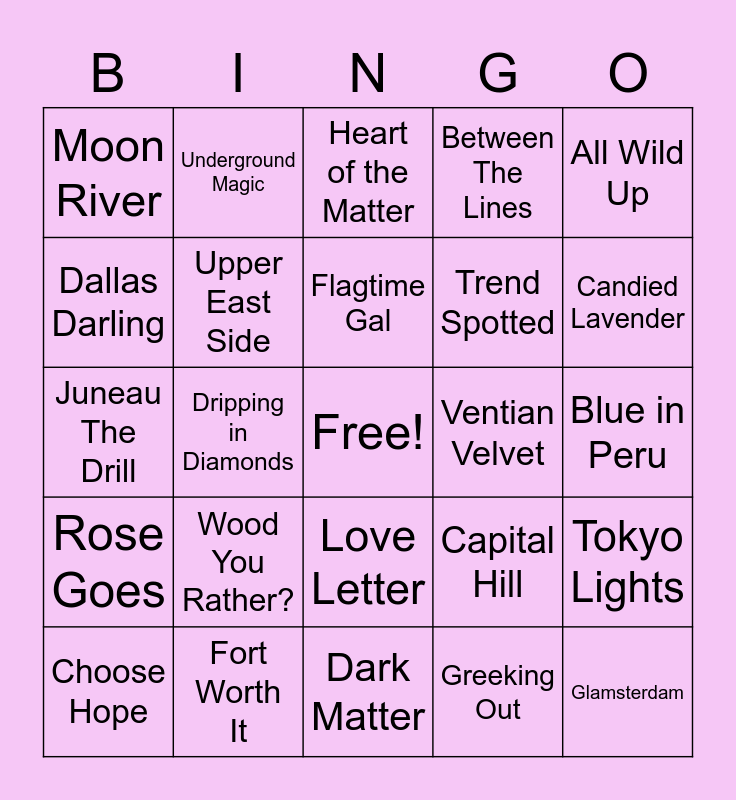 This bingo card has a free space and 68 words: I Want Scandi, Glamsterdam, Space Case, Snake My Day, Glittersweet, Coral Bay, Underground Magic, Cran-Tastic, Flagtime Gal, Smokes On You, Love Letter, Beijing Beauty, Blue in Peru, All Wild Up, Brave and Beautiful, Dallas Darling, Dripping in Diamonds, Moon River, Pink Peppercorn, Wood You Rather?, Trend Spotted, Capital Hill, Rose Goes, Coming Up Rose Gold, Munich Mulberry, Rule Of Plum, Scot Topic, Swiss and Tell, Tokyo Lights, It’s A Key-per, Heart of the Matter, How You Dune?, Charleston Blush, Plaid About You, Between The Lines, Champagne Sugar, Blushing and Flushing, Choose Hope, Candied Lavender, Juneau The Drill, Only In Vegas, Belgium Buttercup, Upper East Side, Aspen Sky, Giza Sands, Soho-Ver It, Berlin To Win It, Suit Yourself, Ventian Velvet, Fort Worth It, Oslo and Steady, Himalayan Salt, Midnight In Manhattan, Dark Matter, Holidaze, French City Of Love, Greeking Out, Moscow Or Never, Havanah Honey, Home Sleet Home, Sahara Jewel, Light Year, Hiss and Make Up, Russian Around, Seattle Royale, Chile It Cool, Plaid Reputation and Czech Me Out.