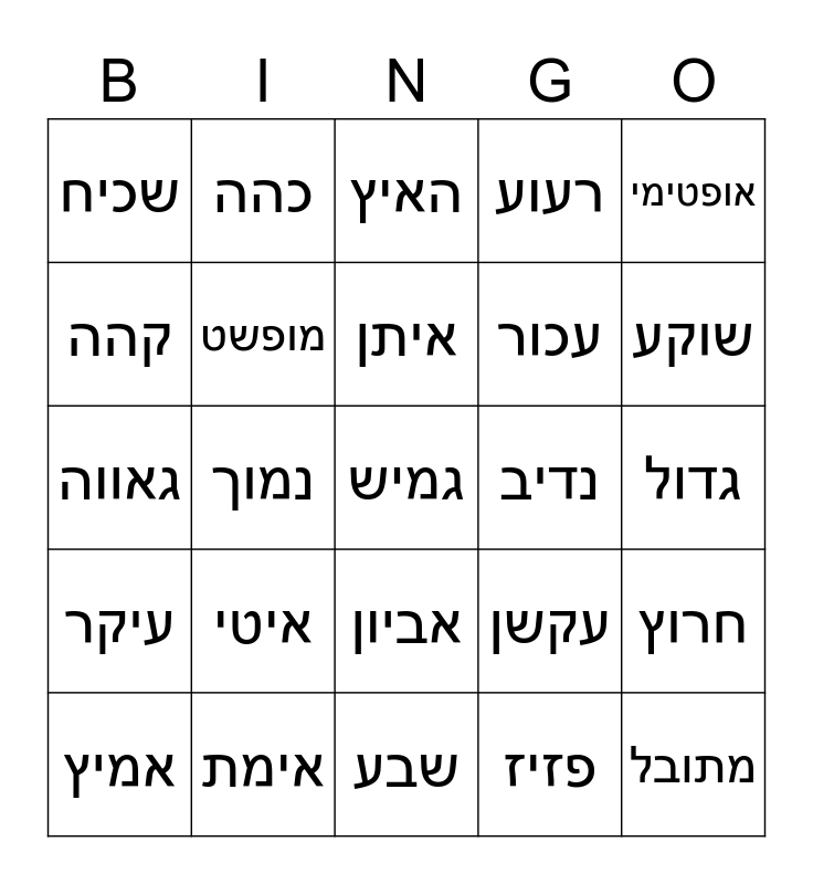 This bingo card has a free space and 24 words: איטי, אימת, איתן, אמיץ, אופטימי, שכיח, קהה, כהה, נדיב, אביון, עכור, גאווה, עקשן, חרוץ, מופשט, פזיז, גדול, האיץ, שוקע, נמוך, מתובל, עיקר, רעוע and שבע.