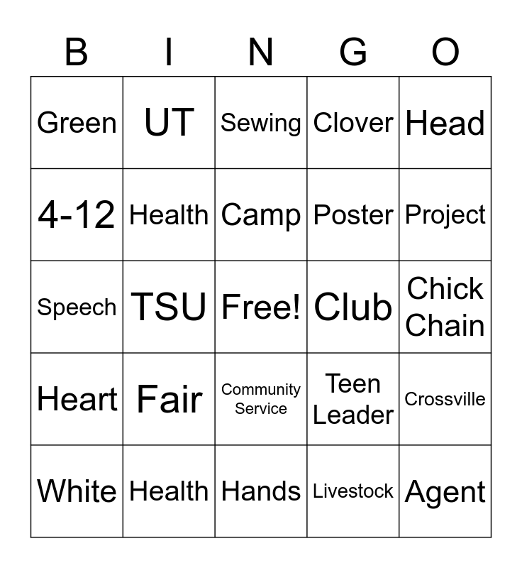 This bingo card has a free space and 24 words: Fair, Health, Camp, White, Head, Green, 4-12, UT, Club, Community Service, Poster, Speech, Teen Leader, Crossville, Health, Livestock, Chick Chain, Sewing, Project, TSU, Agent, Heart, Clover and Hands.