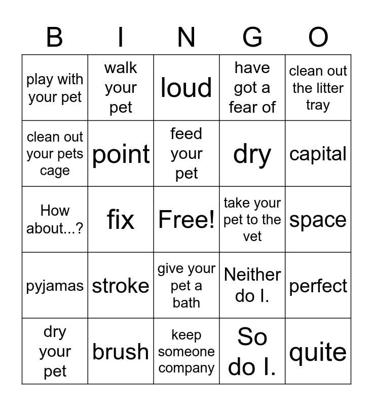 This bingo card has a free space and 24 words: stroke, brush, feed your pet, dry your pet, clean out the litter tray, play with your pet, clean out your pets cage, walk your pet, take your pet to the vet, give your pet a bath, dry, How about...?, Neither do I., perfect, point, So do I., space, loud, capital, fix, quite, pyjamas, have got a fear of and keep someone company.