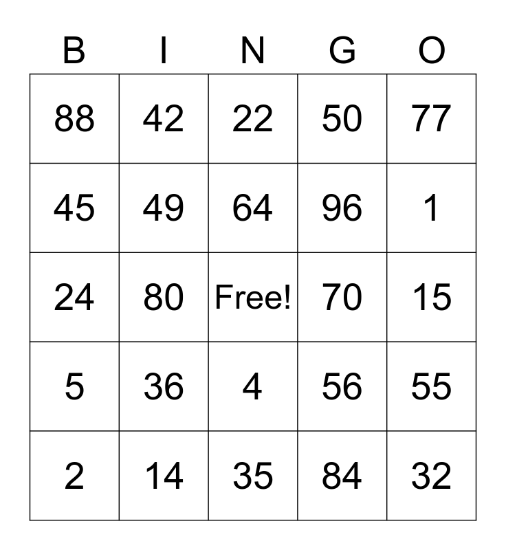 This bingo card has a free space and 46 words: 30, 32, 33, 35, 36, 40, 42, 44, 45, 48, 49, 50, 55, 56, 60, 63, 64, 70, 72, 77, 80, 84, 88, 96, 0, 1, 2, 3, 4, 5, 6, 7, 8, 10, 12, 14, 15, 16, 18, 20, 21, 22, 24, 25, 27 and 28.